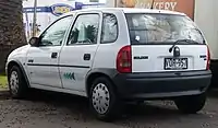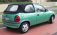 From November 1997 until late 2000, Holden sold the Barina Cabrio soft top convertible.[10] Only 581 were sold. Based on the Barina City three-door hatchback,[11] the soft top version was built in Spain like the rest of the SB series lineup.[12] However, once imported into Australia, Holden organised for the conversion into cabriolets at Clayton, Victoria through its performance vehicle partner, Holden Special Vehicles (HSV).[10] Separately in mainland Europe, the same concept was sold from 1995 as the Opel Corsa Twister, converted by R&R Kupfer in the Dutch city of Dordrecht.[13] A small number were exported to the United Kingdom between 1998 and 1999 for sale with Vauxhall Corsa branding.[14][15]