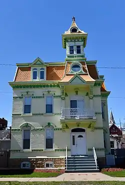 The Hollenfelz House, also known as St. Mary's High School for Boys, is a historic building located in Dubuque, Iowa, United States. This highly decorative Second Empire structure was built as a home for Michael Hollenfelz, who owned a wholesale firm dealing with wines, liquors and beer. The building features a mansard roof with dormers and a cupola, which is normal for this style, and High Victorian decorative details, which is not.[2] Particularly unusual is the cornice and the stringcourses. In 1906 it was acquired by St. Mary's Catholic Church across the street for a boy's high school. The school was operated by the Brothers of Mary from St. Louis, and its curriculum focused on business and commerce. That school ceased operations in 1929 and the building was then used for the parish grade school. In 1957 it was converted into an apartment building. It was individually listed on the National Register of Historic Places in 1977,[1] and it was included as a contributing property in the Washington Residential Historic District in 2015.[3]