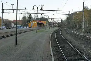 Holmestrand Station is located just outside the town center, close to Holmestrand Bad.[1] The station is located on the Vestfold Line, at milestone 86.09 kilometers (53.49 mi) from Oslo and at an elevation of 4.8 meters (16 ft) above mean sea level.[3]