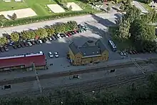 The station was built as a third-class station. The original floor plan consisted of a station master's office, three other offices, a ticket office, an express cargo expedition, a waiting room and a restaurant on the ground floor. The upper story consisted of a station master's apartment, with four rooms, a kitchen and a maid's room. The station complex further consisted of a cargo house, a water tower and two sheds, a smithy and warehouse for the track division. All the machines were run via a belts from a central engine.[1] Water was supplied from a basin at the top of Holmestrandsfjellet.[2]