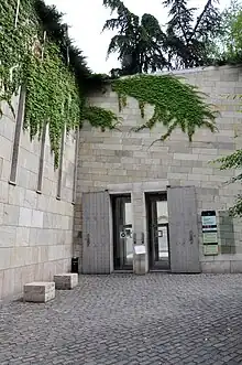 The Holocaust Memorial Center is a former synagogue, the Páva Synagogue, at 39 Páva Utca, Budapest. It is a national institution established by the Government in 1999 and renovated and opened as the memorial and museum in 2004. It is the first Holocaust Memorial Center in Central Europe founded by a state.[3] The museum was designed by architect István Mányi and Attila Gáti. Architecturally, the building is asymmetrical. A set of stairs lead visitors to the exhibitions, meant to "symbolize the distorted and twisted time of The Holocaust."[4] There are permanent and temporary exhibits, and a research center.[2] The research center offers people to search for their family member and have the chance to add to the list of names, increasing their database.