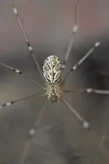 Holocnemus pluchei, commonly known as the marbled cellar spider, is a species of Pholcidae, a family commonly referred to as "cellar spiders" or "daddy long-legs". This species is distributed across the North Pacific region of the United States, as well as in parts of North Africa, Europe, and the Mediterranean.[1] It is considered a common household spider and builds its nest in attics, basements, and eaves of houses.[1] Although some members of the species live in solitary webs, the majority join already existing webs[2] and migrate to new webs multiple times throughout the course of their lives. A unique feature of H. pluchei is that while in many species of spiders, stridulation commonly occurs by males during sexual encounters, in H. pluchei, females also possess stridulatory organs, and both sexes engage in stridulation.[3]