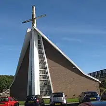 Holy Cross Church, Gleadless Valley, is a Church of England church building in the City of Sheffield, England.[1][2] It is situated on Spotswood Mount and is a distinctive building constructed in 1964/65 and designed by the architects Braddock & Martin-Smith. It is positioned in a spectacular position among the houses on the Rollestone hillside. It has a canted front which is triangular in shape which has a large white cross at its apex. The interior features full height stained glass windows of the Virgin Mary and St John by John Baker.