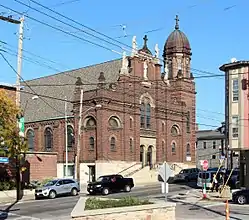 Many of Holy Rosary's earliest members were stone cutters,[2] but their church does not reflect their craft: its walls are brick. The foundation is stone, and copper and stone are used for various external details.[1] At the center of the facade, flights of stairs provide access to the double doors at the main entrance, above which two large arched windows are placed. The bays on the sides of the facade include large arched areas filled primarily with brick; only small arched windows and oculi penetrate these walls. Two belt courses, the lower more prominent than the upper, appear near the top of the facade; one is interrupted by the large arch windows above the entrance, while the other sits immediately above them. Numerous statues stand atop the facade at its significant points, while the building's eastern corner is topped by a domed cupola.[3]