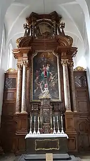 Latterly the municipal building complex served as a retirement home until 1997, when this was shut down. The residents at the time were relocated to premises outside of the town centre, which were the site of the municipal hospital from 1862 to 1984.[2] In 2015 the church was renovated for €725,000. During the eight-month construction period the roof truss was secured and a new coat of paint was applied to the façade.[3] Today the church is used for worship, weddings and concerts. During Advent and Christmastime a magnificent nativity scene is displayed, some of whose figurines are more than 200 years old. The crib, which is altered many times between the first day of Advent and Candlemas, is part of the Pfaffenhofen Krippenweg.[1]