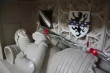 The tomb of Sir William Clopton is set into an alcove here, in the north wall. An effigy of Sir William, wearing chain mail and plate armour, is set on top of the tomb. Sir William is known to have died in 1446 and it is therefore believed that this corner of the church predates the late 15th-century reconstruction. There are numerous brasses set in the floor commemorating other members of the Clopton family; two date from 1420, another shows two women wearing head attire in the butterfly style from around 1480, and a third depicts Francis Clopton who died in 1558.