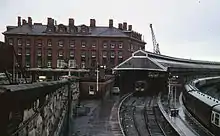 The present station was opened by the London and North Western Railway on 17 January 1866[2] and still retains its overall roof. It is believed to be the longest train shed in Wales.[1] It originally had four platforms, but only three are currently in use, the track to the former platform three having been lifted. The station approach contains a Grade II listed clock turret[3] which was unveiled on 17 June 1878 by Albert Edward, Prince of Wales to mark completion of old harbour extension. The clock is by J. B. Joyce & Co of Whitchurch.