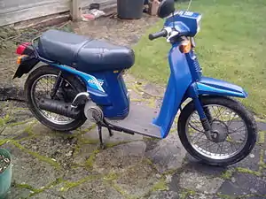 The Honda SH50 is a 49 cc (3.0 cu in), air-cooled, two stroke, single cylinder, scooter style, restricted moped manufactured by the Honda Motor Company between 1984 and 2006, with substantial revisions for the 1996 model year. It was equipped with continuously variable automatic transmission, (Honda V-Matic transmission) together with both electric and kick start, automatic choke[4] and capacitor discharge electronic ignition.[5] Brakes were drum front and rear, (disc front on later models) operated pedal-cycle style by two handlebar levers. The early models had some resemblance to Honda's C50/70/90 Super Cub range with a similar shape, dual seat and rear carrier, but with a scooter type floor, unlike the P series of mopeds such as the Honda PC50 or the Honda Express N series, which had cycle style construction. The SH50 was also known as the City Express and in some markets, as the Scoopy. All models had cycle type wheels as against the smaller wheels of later 50cc scooter style mopeds. The battery, fuel tank and two-stroke-oil reservoir were contained under the seat. Electrics were 12 volt and a handlebar mounted binnacle, which effectively formed part of the front bodywork, contained basic instrumentation and warning lights.