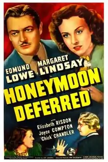 Honeymoon Deferred is a 1940 American mystery film directed by Lew Landers and written by Roy Chanslor and Eliot Gibbons. The film stars Edmund Lowe, Margaret Lindsay, Elisabeth Risdon, Chick Chandler, Joyce Compton, Cliff Clark and Anne Gwynne. The film was released on February 16, 1940, by Universal Pictures.[1][2][3]