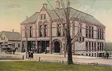 Hopedale was first settled by Europeans in 1660. Benjamin Albee[2] built a mill on what is now the south end of Hopedale in 1664. A 64-square-mile (170 km2) area of the Blackstone Valley was incorporated as the town of Mendon. In 1780, Milford separated from Mendon. On August 26, 1841, Adin Ballou, along with the Practical Christians, gave Hopedale its name, within the town of Milford. Ballou and the Practical Christians established the Hopedale Community based on Christian and socialist ideologies in 1842. The utopian commune went bankrupt in 1856, and its assets were purchased by Ebenezer and George Draper, manufacturers of looms.[3] Various industries developed under the direction of the Draper brothers, including the Hopedale Machine Company and Hopedale Furnace Company. The town was officially incorporated in 1886 when it separated from Milford. George Draper designed, paid for, and constructed the town hall, which is constructed of granite from Milford and sandstone, and was dedicated in 1887.[3] The Unitarian church was another gift from the Drapers, and the Bancroft Memorial Library was a gift from a superintendent at the plant.[3] The marble sculpture outside the library was paid for by the Drapers and shipped from Rome in 1904.[3] In 1905, women were granted permission to swim at the town beach.