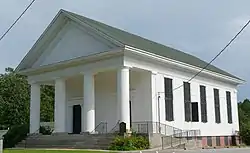 It is made of George longleaf yellow pine (heart pine), on a brick foundation. It has four masonry front porch columns supporting a large pediment in the front gable. It has an entablature and pilasters and two door openings in the front (north-facing) facade. It has five windows on each side and two on the south end, all windows being original, large 16-pane over 16-pane windows.