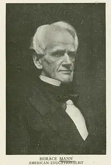 The Horace Mann School was named after Horace Mann who was a lawyer who served in the Massachusetts State Legislature. He also was the first Secretary of the Massachusetts Board of Education (in the years between 1837 and 1848), a Member of the United States House of Representatives, and the first President of Antioch College. He used each of his positions to proclaim that every person, regardless of their background, should receive a public education based on the principles and practices of a free society. Horace Mann played a leading role in establishing the elementary school system in the United States.
