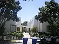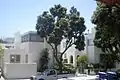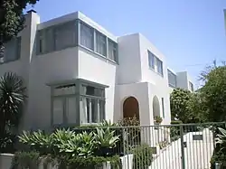 Horatio West Court divides its narrow lot symmetrically, placing two units on either side of a driveway that runs the length of the lot to a rear parking area, where two garages are topped with little apartments.[3] Each building is a slightly inflected, flat-roofed two-story cube to which a small entrance porch and a walled terrace has been added. The arched entry ways and small patio courts reflect Gill's affinity for the Mission Revival style.[4] However, the buildings themselves fall squarely into the Modern Movement.
