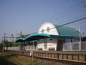 The station has a single side platform serving bi-directional traffic, connected to a small station building with rounded walls.