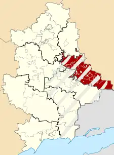 Horlivka Raion (Ukrainian: Горлівський район, romanized: Horlivskyi raion; Russian: Горловский район, romanized: Gorlovsky rayon) is a prospective raion (district) of Donetsk Oblast, Ukraine. It was formally created in July 2020 as part of the reform of administrative divisions of Ukraine. The center of the raion is in the town of Horlivka.[3][4] Population: 662,069 (2022 estimate).[2] The area of the raion is occupied by Russia, which continues to use the old, pre-2020 administrative divisions of Ukraine. Prior to the 2022 Russian invasion of Ukraine, portions of the northern Maiorsk district of Horlivka were the only notable areas of the raion under Ukrainian government control.