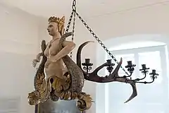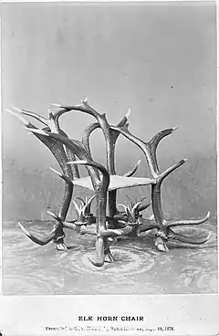 Antlers were already used in the late 15th century as a source material for clothes hooks, storage racks and chandeliers, the so-called "lusterweibchen".[2] Furniture made by antlers have been invented in the 19th century and can therefore be assigned to the Biedermeier period.[3] They were exclusively made for the European nobility to decorate their hunting castles and various manors. Historically mentioned horn furniture was developed in the year 1825 for a hunting castle of the count William of Nassau near Wiesbaden, Germany, A photograph of 1890 is the single existing evidence as the castles was destroyed in World War II and the interior furniture is regarded as lost. Further known collections of historic horn furniture are credited with the hunting room in the country estate of the Brandhof of the Archduke Johann of Austria or the antler collection of count Arco in Munich, Germany. Many other examples of horn furniture of that time can only be found with drawings and pictures, e.g. Joseph Danhauser (1780–1829) an Austrian furniture manufacturer left hundreds of drawing and another well-known aquarelle is the dressing room of Ferdinand Baron von Hildprandt.[4]