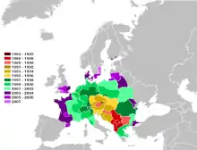 Cameraria ohridella has now been found in Albania, Austria, Belgium, Belarus, Bosnia and Herzegovina, Bulgaria, Croatia, the Czech Republic, Denmark, England and Wales, Estonia, Finland, France, Germany, Greece, Hungary, Ireland, Italy, Kosovo, Latvia, Liechtenstein, Lithuania, Luxembourg, Moldova, Montenegro, the Netherlands, North Macedonia, Poland, Serbia, Romania, Russia, Serbia, Slovakia, Slovenia, Spain, Sweden, Switzerland, Turkey and Ukraine.[7] Although horse-chestnut occurs naturally mostly above the 700–1,000 m (2,300–3,300 ft) contours[3] the moth does well in well-watered places such as parks in cities and at low elevation but not well in the hotter parts of Europe e.g. Spain.[7] Probably aided greatly by vehicular transport, the moth has attained a very rapid dispersal rate across Europe of 60 kilometres (40 miles) per year.[8][9]
