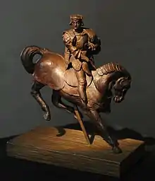 The sculpture was attributed to Leonardo da Vinci by art historian Carlo Pedretti in 1985,[21][22] mainly due to a note Leonardo had written for himself in another work. On a c.1503-1504 worksheet from the Codex Windsor set of Leonardo's drawings are sketches of horses, believed to be part of a study for the painting of The Battle of Anghiari. In the middle of the sheet is a note to "make one of wax about finger long",[23][24] and the bucking posture of one of the horses is similar to the sculpture.[14] Leonardo may indeed have used wax models to prepare for Anghiari.[25] Art historian Patricia Trutty-Coohill also noticed a resemblance between the rider and Charles II d'Amboise from Andrea Solari's painting from c.1507. Charles was one of Leonardo's patrons, and the subject matter would suit what's known of him.[6] The beeswax statuette, including black and white photographs, was first published as a work by Leonardo in 1987 in "The drawings and miscellaneous papers of Leonardo da Vinci" in The collection of Her Majesty the Queen at Windsor Castle. The book was part of a series that Pedretti had taken over from Kenneth Clark, cataloging Leonardo's drawings stored in the Royal Collection in Windsor Castle.[9]