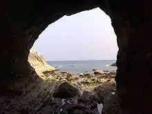 The seabed is rocky and the beach comprises a steep bank of flint pebbles. The cliffs are sheer, concave and are made of chalk, which is unstable and persons on the beach are at risk of being injured by falling rocks dislodged by the many seabirds that use the cliff as a breeding ground.[3] Horseshoe Bay lies north-north-east and adjacent to, two caves known as The Nostrils. These can be reached by scrambling over a small rocky outcrop and are partly submerged at high tide.