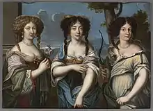 Details of the painting Three Nieces of Cardinal Mazarin: Marie (left), Olympia (center), and Hortense (right), c. 1660s