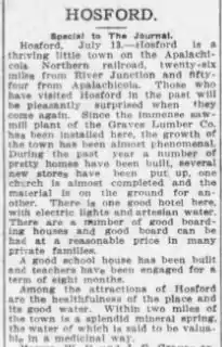 In 1910, the Hosford Lumber Company filed for bankruptcy. A 1912 article by The Pensacola Journal described Hosford as a "thriving little town." Graves Saw Mill helped foster the growth in Hosford. Visitors to Hosford could stay at the local hotel with electricity and artesian water and visit the local mineral spring. By this time, Hosford already had a local school and local church.