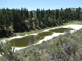 Hot Lake is a hypersaline, meromictic lake located in extreme northern Okanogan County, Washington near Oroville, Washington.[2] Occupying a small, glacially-carved basin surrounded by mafic magnesian rocks, dolomites, and shales containing deposits of pyrite and pyrrholite minerals, Hot Lake is unusual among hypersaline lakes in that it is dominated by magnesium and sulfate as its major ions.[3] Because of its mineralogy, Hot Lake was mined for epsomite, initially by the Stewart-Calvert Company during World War I, when the importation of epsomite from Germany was suspended.[4] Major flora growing within the lake include Ruppia maritima[5] and Chara, and the dominant fauna are the brine shrimp Artemia salina and Branchinecta campestris.[2] A benthic phototrophic microbial mat dominated by cyanobacteria is also found within the lake.[2]