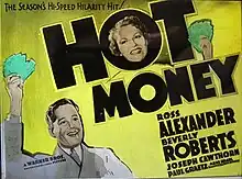 Hot Money is a 1936 American comedy film directed by William C. McGann and written by William Jacobs. The film stars Ross Alexander, Beverly Roberts, Joseph Cawthorn, Paul Graetz, Andrew Tombes and Cy Kendall. The film was released by Warner Bros. on July 18, 1936.[1] It was based on the play of the same name by Aben Kandel who also co-wrote the screenplay. The story was used twice before in films as High Pressure (1932) and a French speaking version in the same year Le bluffeur.