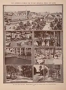 By 1902, according to a Souvenir of the City of San Antonio, the three-story Hot Wells Hotel had 80 rooms with modern conveniences including first-class furnishings, individual telephones to the main office, steam heat, electric and gas lights, and hot and cold water.[2] The octagonal bathhouse had 45 private bathrooms each with porcelain tubs, marble partitions and tile floors. Guests were segregated by sex for Roman, Russian or Turkish, steam, needle and shower baths. The water ran at 104 degrees but could be individually controlled. Three public pools (64 feet by 90 feet each) were lined with white enameled brick.[2] The Hot Wells spa was reputed to have better water quality than either the then-popular Hot Springs, Arkansas or the then-acclaimed Carlsbad, Germany spas. As elsewhere, bathing was dissuaded if suffering lung problems—it was thought the water's warmth would cause suffocation by "clos[ing] the lungs." Syphilis sufferers were made to bathe privately.[2] In addition to swimming parties, there were domino parties, concerts and lectures there during these early years. The Hot Wells Bowling Club played on nine- and ten-pin alleys.[19] There seems to have been a long tradition of Friday night dances at the Southwestern Insane Asylum where hotel guests frequently fraternized with and without patients present.[19][20]