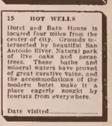 - ↑ San Antonio, The Mecca of the Tourist, Hot Wells Hotel, The Haven of Rest. 1910.