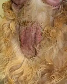 Pyotraumatic dermatitis is more common when the dog's environment is hot and humid.[3] Dogs with thick undercoats or long fur are most commonly affected,[1] but pyotraumatic dermatitis can occur in any dog.[4] Commonly affected breeds include the Airedale Terrier, Akita, American Pit Bull Terrier, Basset Hound, Golden Retriever, Great Pyrenees, Labrador Retriever, Leonberger, Pembroke Welsh Corgi, Peruvian Inca Orchid (Peruvian Hairless Dog), Shiba Inu, and Xoloitzcuintle (Mexican hairless dog)[7] as well as the German Shepherd and St. Bernard.[4]