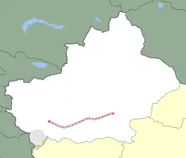 The line is 825.5 kilometres (512.9 mi) long and runs from west to east.[1] In Hotan it continues as the Kashgar–Hotan railway and in Qakilik (Ruoqiang), Ruoqiang (Qakilik) County it branches off the Golmud–Korla railway. Together with those railways it forms a 2,712 km (1,685 mi) loop around the west of the Tarim Basin, linking Hotan, Lop, Qira, Yutian, Minfeng, Qiemo and Bayingolin.[4]