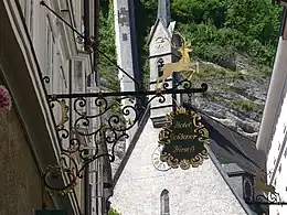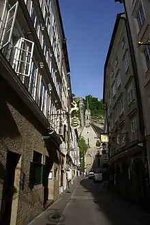 The first recorded documents referencing the building that now houses the Hotel Goldener Hirsch were found in Nonnberg Abbey and date back to 1407.[1] The residents living at 256 Getreidegasse (the old numbering system, now 37) at the time were Heinrich von Hulczein and his wife Liebhart von Hall, Peter Erner von Mattsee, and silversmith Aezius Zehringer.[2] Over the next two centuries, the house was inhabited by Liebhart von Haller (1434), Peter Erner von Mattsee (1438), silversmith Alex Sehringer (1442), fitter Bernhard Stockär (1453), locksmith Bartlmee Falk (1463) who enlarged the house, blacksmith Niklas Warislochner (1478–1501), widow Margareth Warislochner (1512), Heinrich Warislochner (1520), his cousin Ruprecht Thenn (1535), Georg Thenn (1547), and Friedrich Hormann (1562).[2]