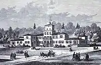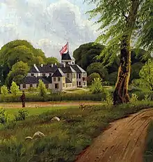 In the second half of the 19th century, the Øresund coast became a popular summer destination for wealthy citizens from Copenhagen. J. S. Nathanson, a broker from Helsingør, rented Marienlyst House from Helsingør Municipality with the intention of opening a spa hotel.[2] His inspiration came from visits to spa towns in Germany. As a publicity stunt, to profit from nearby Kronborg Castle's reputation as the home of Hamlet, he renamed a natural spring in the cliff behind the house Ophelia's Spring and constructed Hamlet's Grave nearby. Marienlyst Spa (Marienlyst Kur- og Søbadeanstalt) opened on 1 June 1858. Nathansen also charged the architect Niels Peder Christian Holsøe with the design of a new hotel building but went bankrupt before it had been completed and the project was there taken over by Helsingør Municipality. The new hotel building was inaugurated on 22 June 1861 with J. W. Briggs as operator. When Sarah Benhard was in Copenhagen in the summer of 1880 to perform in Adrienne Lecouvreur at the Royal Theatre, she visuted Hotel Marienlyst to see the Tomb of Hamlet and Ophelia's Spring.[3]