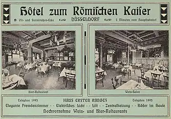 The previous building of the hotel was at Benrather Straße 3.[2][3] From 1903 to 1904 Josef Kleesattel built the four-story corner structure with stone facades at the corner of Steinstraße 70 (today Stresemannstraße 26). The building contractor was FW Zensen.[4] Hermann vom Endt designed the beer and wine bars that were connected to the hotel. Its location was touted on advertisements as being only five minutes away from Düsseldorf's main train station, and was equipped with all the modern conveniences of the time, including electric lights, an elevator, and central heating. The Düsseldorf Yacht Club was founded on the hotel's premises in 1908.