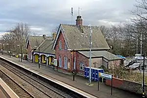 It had two platforms, both accessed by steps and a ramp down from the road overbridge, the Liverpool bound platform could also be accessed from the road access to the station building, on either side of two running lines, the Liverpool platform had a siding at its back that was not available for passenger use[9] There was a goods yard to the south of the lines and east of the station.[10] The goods yard was able to accommodate most types of goods, including livestock, it was equipped with a five-ton crane.[11]
