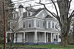 Built c. 1845, this two-story Greek Revival house is one of the first to be built when the Auburndale area was subdivided for suburban development. The 2+1⁄2-story wood-frame house has a porch, supported by paneled square columns, that wraps around two sides. Its gable roof, while oriented with the roof line parallel to the street, has a fully pedimented gable end, as do the dormers that pierce the roof.[2]