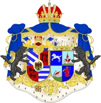 - Art 5 °. The coat of arms used by the aforementioned princes, will be the ancient of his family, with mantle and crown of Prince, and having as support the two rampant wolves of the same shield of his family, granting them by special grace the use of the National Shield in the center of the aforementioned blazon, according to the design that is attached.
