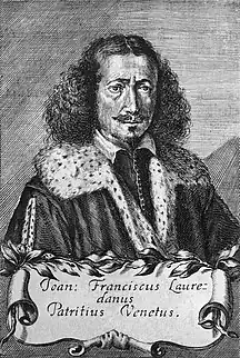 Giovanni Francesco Loredan, born in 1607, was a writer and politician. He was born in Venice as the son of Lorenzo Loredan and Leonora Boldù.[16] When both of his parents died while he was very young, he was raised by his uncle Antonio Boldù and had as his teacher Antonio Colluraffi.[17][18] He divided his youth between hard study and an extravagant lifestyle.[19] He attended the classes of renowned Aristotelian philosopher Cesare Cremoni in Padua and began, before 1623, to gather around him the group of scholars who then formed the Accademia degli Incogniti, also called the Loredanian academy.[20] As founder of the Accademia degli Incogniti and a member of many other Academies, he had close contact with almost all the scholars of his time.[21] He and his circle played a decisive role in the creation of modern opera.[22][23] In addition to literary activity, he also took part in public affairs.[24] At twenty he was recorded in the Golden Book, but his career began quite late: in September 1632 he was elected Savio agli Ordini and in 1635 he was treasurer of the fortress of Palmanova. On his return in 1636 he reorganized the Accademia degli Incogniti and, in 1638, despite attempts to avoid it, he was obliged, as the only descendant of his branch, to contract marriage with Laura Valier.[25] He was then Provveditore ai Banchi (1640), Provveditore alle Pompe (1642), and in 1648 he made the leap to the rank of Avogador del Comùn that he held several times (1651, 1656 and 1657).[26] He subsequently joined the office of the State Inquisitors and became a member of the Council of Ten. In 1656 he entered the Minor Consiglio, that is, among the six patricians who, together with the doge, composed the Serenissima Signoria. However, he may then have been pushed out of office, as in the following years he no longer held important positions. In 1660 he was a Provveditore in Peschiera. The following year, on the 13th of August 1661, he died.[27]