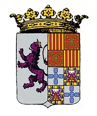 The second, of the Portugal-Noronhas , in the I and IV quarters, shows five blue shields cross-shaped, each with five silver bezants, placed to quincunx of the House De Portugal and, in the II and III quarters, the castle with the three golden towers surmounted by two crimson lions of the House of Castiglia and of Leon. The quarter is framed by nine golden squares alternated by nine blue towers. Doña Isabel de Portugal, bastard daughter of King Ferdinand I, married Don Alfonso Dount of Gíjon Noronha, bastard son of the King Enrico II di Castiglia. Heraldry joins the symbols by matrilineal descent: Portugal-antigo (only because of the matrilineal line of the descendants of Doña Isabel, daughter recognized by the King Ferdinando I) with the one of the Noronhas.[14]