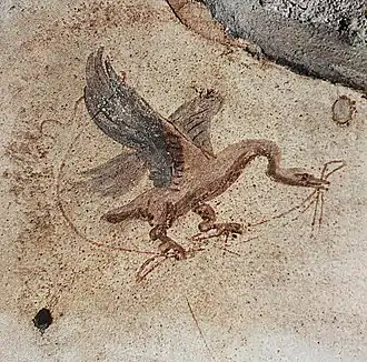 This storage area had only the remains of coarse plaster on the walls. Finds included an elliptical bronze figure-shaped basin, two bronze casseroles with perforated handles, a bronze base with a handle terminating in swan heads and a mask in the fragmented bottom, another bronze basin without handles, a bronze clasp, a bronze hook, and a corroded as minted by Tiberius. Other finds included two terracotta procoes, a lagena with two handles, an amphora with two handles, a pignattino with a cover without handles, a fragmented saucepan, an imitation Arezzo pot (Arretine ware), a saucer, a lamp with one luminello decorated with two dolphins and a rudder, a glass odorino, a crustacean shell, a fragmented iron ax and the bones of chickens and sheep.[20]