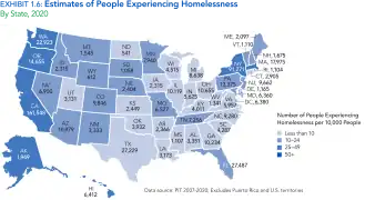 In 2014, approximately 1.5 million homeless people resided in shelters.[30] As of 2018, the Department of Housing and Urban Development reported there were roughly 553,000 homeless people in the United States on a given night,[31] or 0.17% of the population. Recent spikes in the homeless population include a 44% increase in Seattle in 2017[32] and 16% in the city of Los Angeles in 2019.[33][34] In January 2018 the federal government statistics gave comprehensive encompassing nationwide statistics, with a total number of 552,830 individuals, of which 358,363 (65%) were sheltered in provided housing, while some 194,467 (35%) were unsheltered.[35]