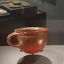 Dated to c. 1750-1550 BCE,[2] the amber cup was found in a Wessex culture grave in a coffin made from a treetrunk. Also in the coffin were a skeleton, a Camerton (Wessex culture) type dagger, a whetstone and a small axe.[3]