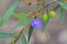 The erect and slender shrub or small tree typically grows to a height of 0.4 to 3 metres (1 to 10 ft).[2] It is usually single stemmed and the young branches are covered in spreading often rust coloured hairs. The stipules are narrow triangular and around 1 millimetre (0.039 in) in length.[4] The alternately arranged leaves have an elliptical blade to around 7.5 centimetres (3.0 in) in length.[5] The species has purple or blue flowers that appear between August and December in its native range.[2] The pea shaped flowers are arranged in short clusters among the leaf axils.[5] The axillary inflorescences contain one to seven flowers. The seed pods that form later are ovoid to ellipsoid in shape and are 0.8 to 1.2 cm (0.31 to 0.47 in) in length and 0.8 to 1.3 cm (0.31 to 0.51 in) wide. The olive brown seeds within have an elliptic shape and 3.8 to 5.1 mm (0.15 to 0.20 in) in length and 2.8 to 3.1 mm (0.11 to 0.12 in) wide.[4]