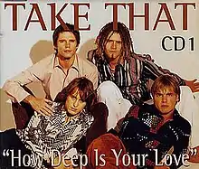 "How Deep Is Your Love" is a pop ballad written and recorded by the Bee Gees in 1977 and released as a single in September of that year. It was ultimately used as part of the soundtrack to the film Saturday Night Fever. It was a number-three hit in the United Kingdom and Australia. In the United States, it topped the Billboard Hot 100 on 25 December 1977 and stayed in the Top 10 for 17 weeks. It spent six weeks atop the US adult contemporary chart. It is listed at No. 27 on Billboard's All Time Top 100.[2] Alongside "Stayin' Alive" and "Night Fever", it is one of the group's three tracks on the list. The song was covered by Take That for their 1996 Greatest Hits album, reaching No. 1 on the UK Singles Chart for three weeks.[3]