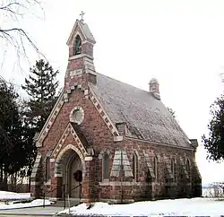 Lakeview Cemetery is located north of downtown Burlington, between North Avenue and Burlington Bay. The Howard Chapel is located near the road, just south of the cemetery's main entrance. It is a masonry structure, built mainly out of Monkton quartzite, known locally as redstone. The redstone has an ashlar finish, and is laid in courses, with gray limestone trim. Its Gothic features include buttresses, lancet-arched windows, and a steeply pitched purple slate roof. Its east-facing gable rises to include a bellcote with a lancet-arched opening.[1]