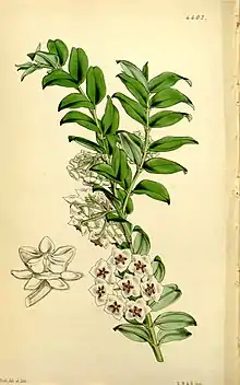 "The most lovely of all the Hoyas, to which a figure (as in the case of most flowers with much white) is little calculated to do justice. It cannot be called a climber, but the branches are diffuse, copiously leafy, so that the leaves (unlike those in H. carnosa) form a dark back-ground to the delicate umbels of flowers, with leaves in shape resembling those of a Myrtle, and flowers more lively and differently-formed from those of Hoya carnosa, and most deliciously scented. The corolla is a purer white, and the corona a deeper purple: resembling an amethyst set in frosted silver."