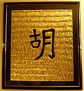 Hu (胡) is a Chinese surname. In 2006, it was the 15th most common surname in China.[1][2] In 2013, it was the 13th most common in China, with 13.7 million Chinese sharing this surname.[3] In 2019, Hu dropped to 15th most common surname in Mainland China.[4]
