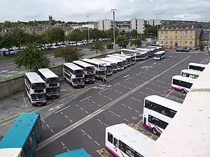 The bus station was opened on Sunday 1 December 1974 and is owned and managed by Metro. It is the busiest bus station in West Yorkshire and is used by more than 33,000 passengers every day.[1][2] The bus station is situated in Huddersfield town centre, underneath the Multi-storey car park. It is bordered by the Ring Road (Castlegate A62) and can be accessed from High Street, Upperhead Row and Henry Street.