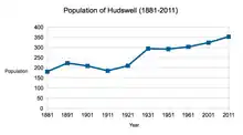 In 1881 the population of Hudswell was 181. By 1891, the population had increased to 223. Between 1891 and 1911, the population decreased, to 209 in 1901 and finally 185 in 1911. By 1931, the population had rapidly increased to 294, where the population remained steady (barring the years of the Second World War where no official 1941 census was produced), and by 1961, the population had grown to 303.[8]