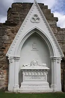 He died at home in St Andrews on the 19 January 1861, and is buried on the north wall of St Andrews Cathedral churchyard, beneath a distinctive and large white monument, with a military motif.[3]